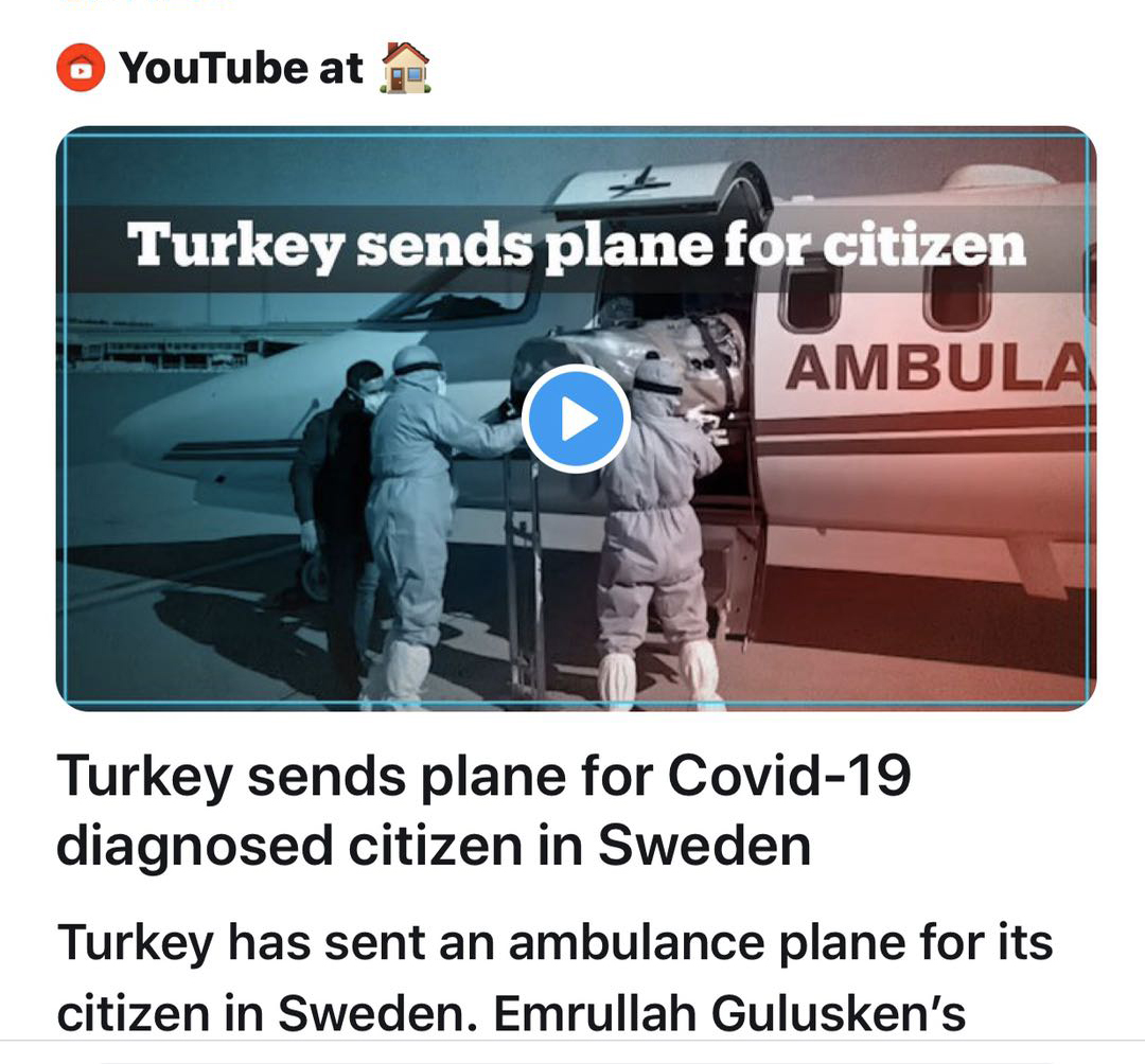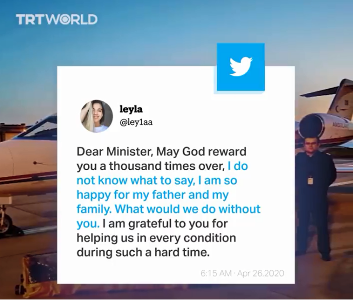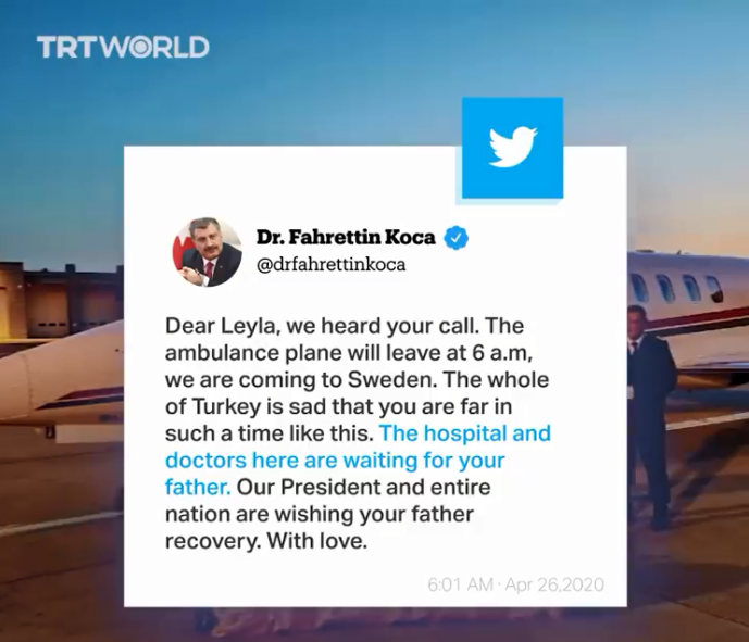 “亲爱的Leyla,我们听到了你的求助。救护飞机计划将于凌晨6点出发飞往瑞典。在这个非常时期,你离我们如此的遥远,整个土耳其都在关心着你。这里的医院和医生正等着你父亲。我们的总统和整个国家都希望你的父亲能够康复。请接受我们的祝福。”