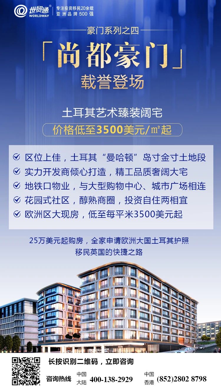 亚洲品牌500强的世贸通集团,作为较早推广欧洲买房移民项目的移民机构,近日携手土耳其实力开发商,向广大投资者介绍又一重磅项目——位置上佳的土耳其“曼哈顿”岛寸金寸土地段,实力开发商倾心打造,欧洲区精工品质奢阔大宅,较具颠覆性的性价比 ,价格低至每平米3500美元起,土耳其艺术臻装阔宅,豪门系列之四「尚都豪门」载誉登场!