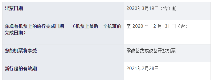 请查看下表,以确保您的国际机票符合所列条款。您可以享受零改签费或改为开放机票的权利。