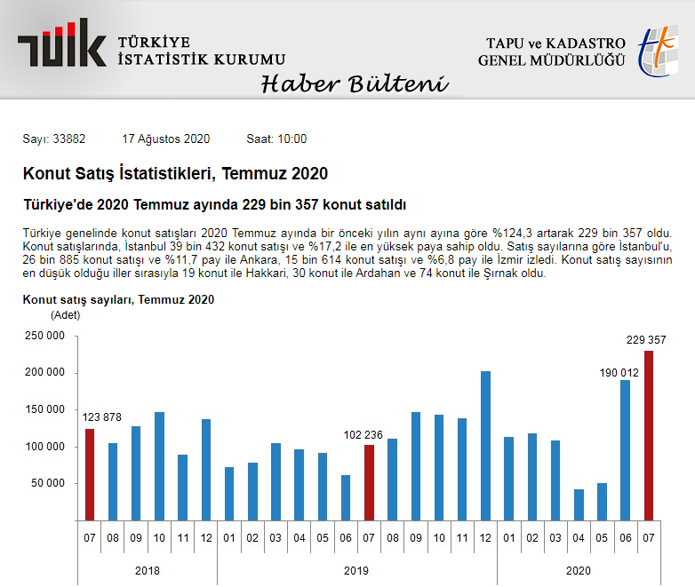 近日,土耳其国家统计局(Turk Stat)新发布的数据显示,2020年7月,土耳其全国房产销售量达到22.9万套,与去年同期相比增长124.3%!其中,国际投资者共计购买土耳其房产2747套,较6月同比增长65%,购房需求继续上升!值得注意的是,2020年1-7月,土耳其共计售出房产88.5万套,较去年同期增长65%,其房产市场的持续火爆程度令人刮目相看!