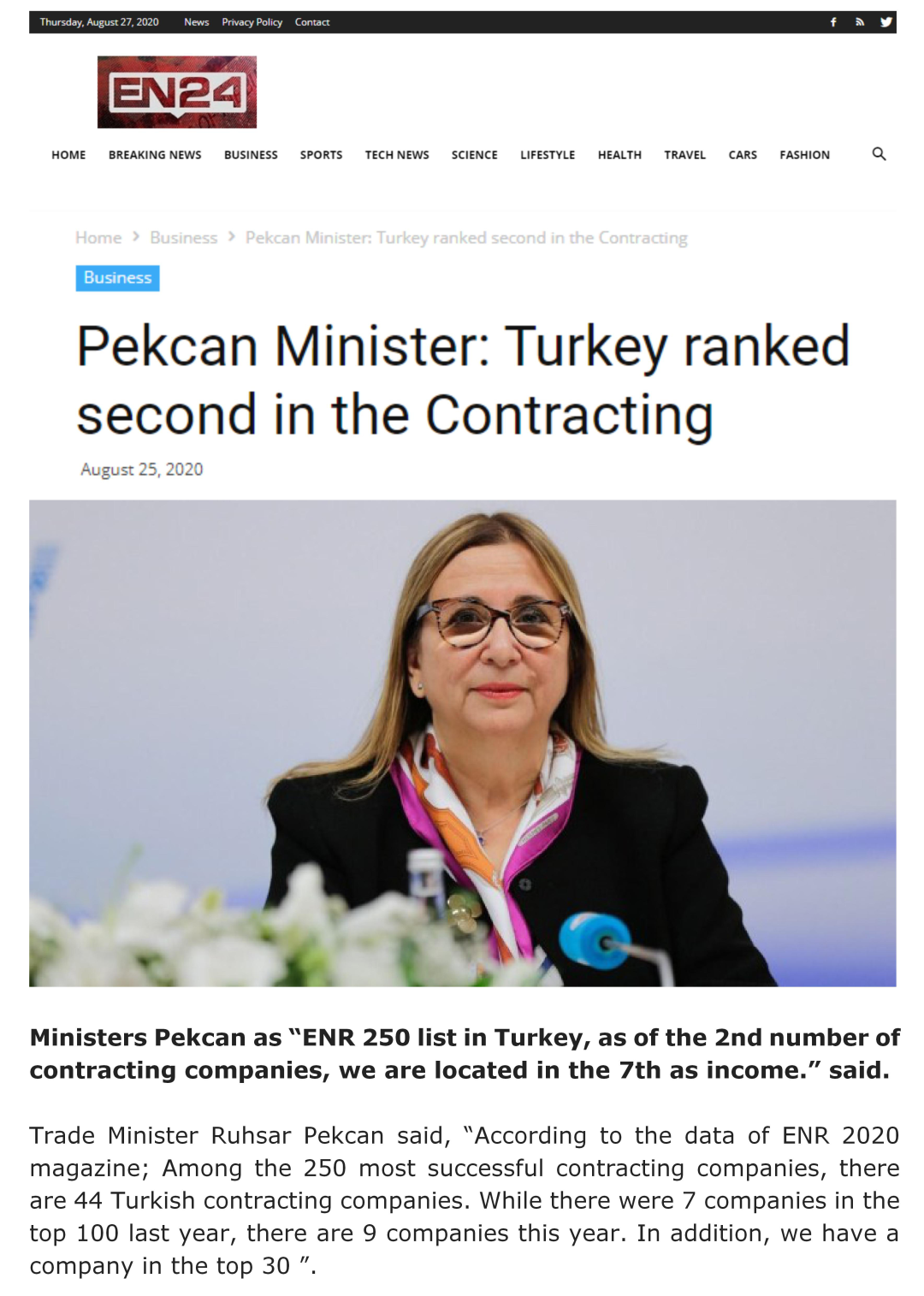 据En24News消息,近日,土耳其贸易部长鲁赫萨尔·佩克坎(Ruhsar Pekcan)在由土耳其承包商协会(TMB / TCA)组织的活动中称:土耳其承包商成功在国际建筑业杂志《工程新闻记录》(ENR)编制的“2020年全球250强承包商”名单中位居第二,名次仅排在中国之后!