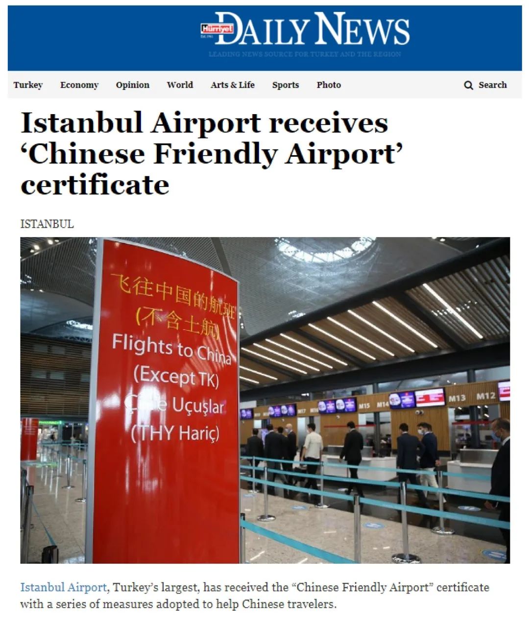 重大好消息!近日,据土耳其自由报每日新闻消息,伊斯坦布尔机场针对中国公民研发了特殊产品和服务,成为全球首个全面实施“中国友好机场”项目的航站楼,已获得中国驻土耳其伊斯坦布尔总领事馆颁发的“中国友好机场”证书。即日起,伊斯坦布尔机场将为从中国抵达的旅客提供全方位中文服务。