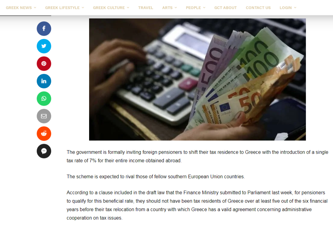 以下三项标准将适用于来自国外的养老金领取者,以确保在未来10年内以7%的统一所得税率在希腊纳税居住: