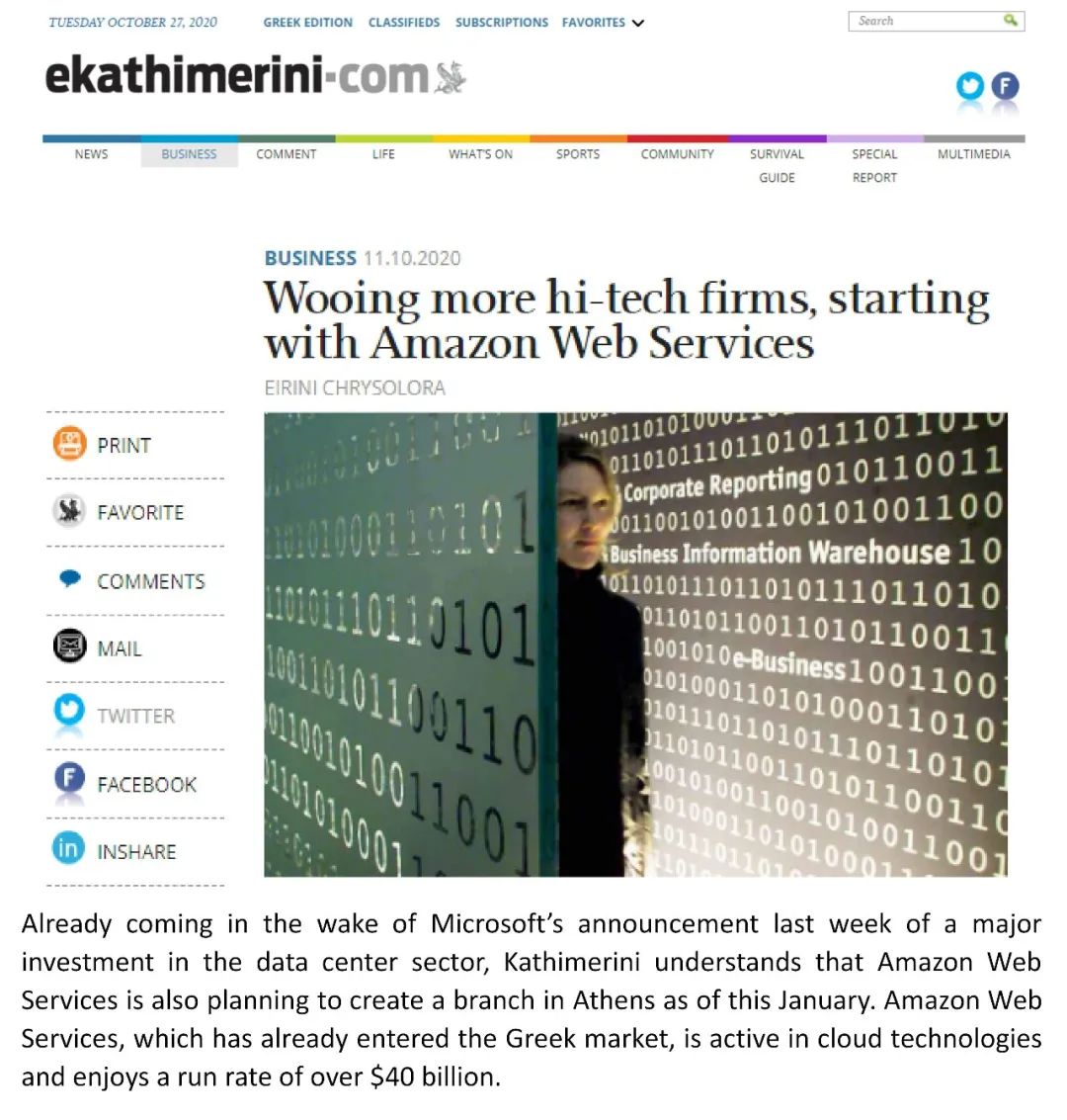 据希腊媒体《每日报》报道,继近期微软加大对希腊数据中心的重大投资之后,投资热土希腊又迎来一国际巨头的进驻!近日,国际巨头亚马逊网络服务公司宣布,将于2021年1月在雅典建立分支机构。