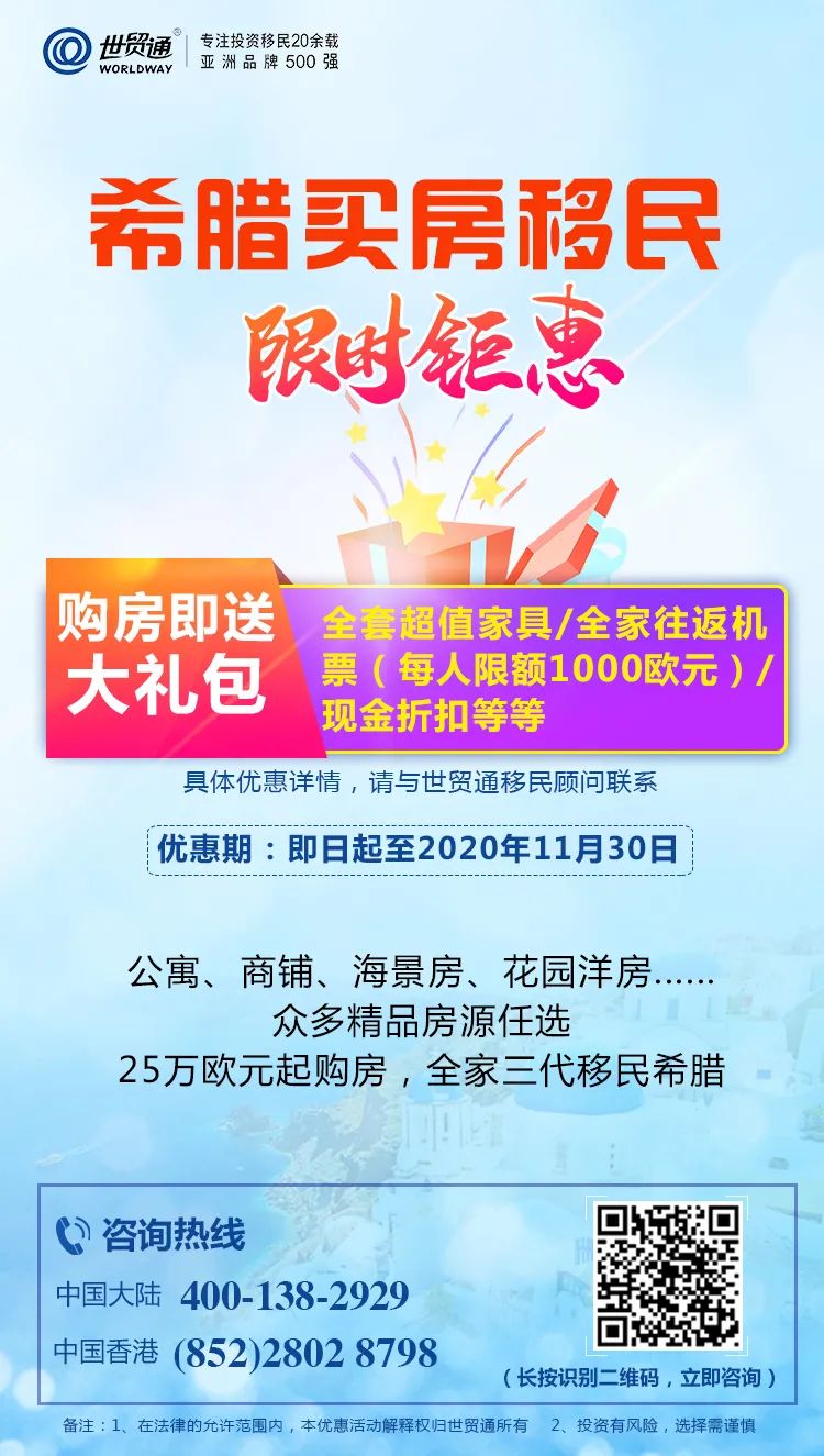 2020年,希腊政府还为广大投资者带来了多项投资移民优惠政策,如:简化申请流程、缩短等待时间、延长居留卡期限等等,为广大投资者增强了希腊移民办理的信心。若您有健康规划、教育、养老、资产配置等需求,一定要提前行动起来。现在正是投资希腊的较佳时期!11月正值希腊买房移民优惠期,机会难得,购房即可获大礼包,有意者须及时把握好时机!