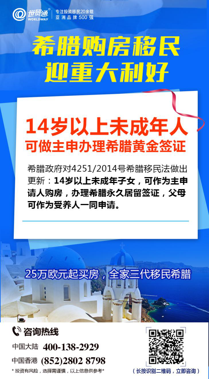 近日,希腊购房移民迎重大利好!根据希腊政府对4251/2014号希腊移民法作出更新:允许第三国14岁以上未成年子女可作为主申请人购房,办理希腊永久居留签证,父母可作为受养人一同申请。