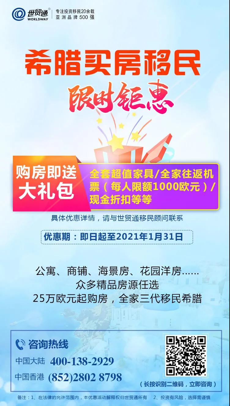 近期,希腊购房移民持续释放利好,如:简化申请流程、缩短等待时间、延长子女身份有效期、允许未成年人作主申请人以及希腊移民递交申请免登陆等等,有意进军希腊的投资者宜把握当前的利好,早申请早受益。现在正是投资希腊的较佳时期!1月正值希腊买房移民优惠期,机会难得,购房即可获大礼包,有意者须及时把握好时机!