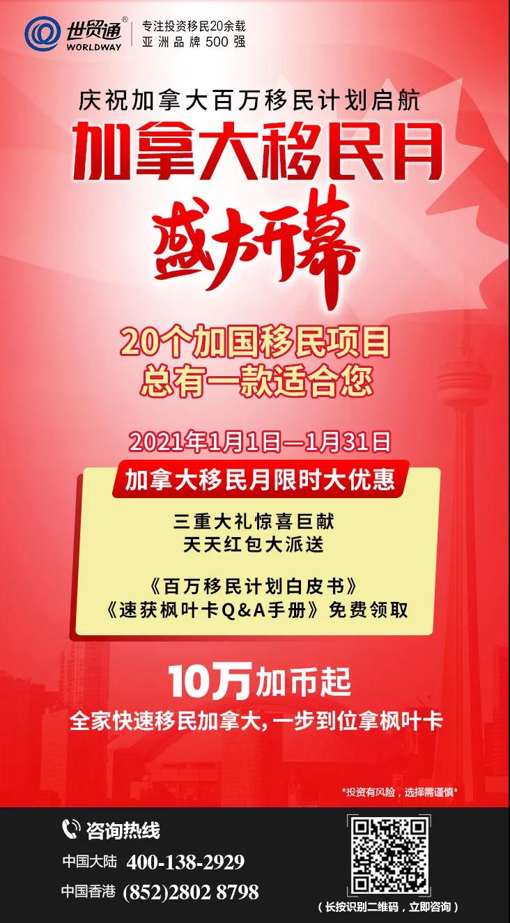 目前,正值加拿大移民月期间,限时大优惠正火爆进行中,三重大礼惊喜巨献,天天红包大派送,《百万移民计划白皮书》、《速获枫叶卡Q&A手册》免费领取。更多优惠,请咨询世贸通集团服务热线,中国大陆:400-138-2929 中国香港:(852) 2802 8798。