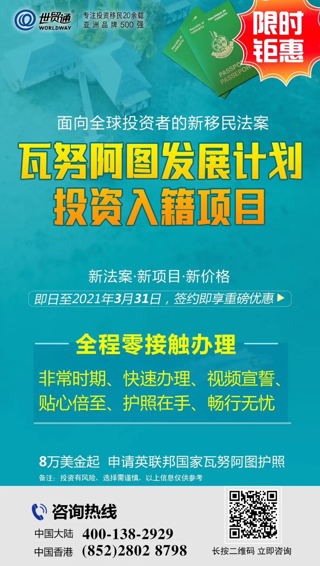 另外,世贸通还有圣卢西亚、瓦努阿图、安提瓜、多米尼克、格林纳达等英联邦国家投资入籍项目,供您选择!更多详情,请拨打世贸通服务热线,中国大陆:400-138-2929 中国香港:(852) 2802 8798。