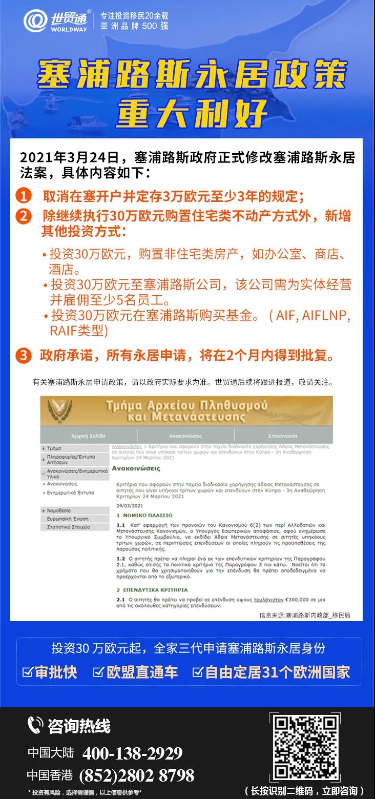 同时还有塞浦路斯永居项目,也是上佳之选,投资30 万欧元起,全家三代申请塞浦路斯永居身份,孩子可享免费公立义务教育,且能以华侨生身份回国报考,轻松入学985、211等一流名校。同时,获得塞浦路斯永居身份,满足相关条件之后,还可申请塞浦路斯欧盟护照。