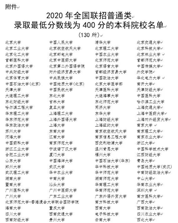 与普通高考相比,华侨生联考虽然也要参加考试,但是考试难度却很低,录取分数线也很低,400分左右就能上国内名牌大学。在官方公布的2020年全国联招普通类录取最低分数线为400分的本科院校名单中,清华、北大等国内学生梦寐以求的一流大学均在其中。同样的大学,与普通高考考生相比,华侨生联考考生更容易被录取!
