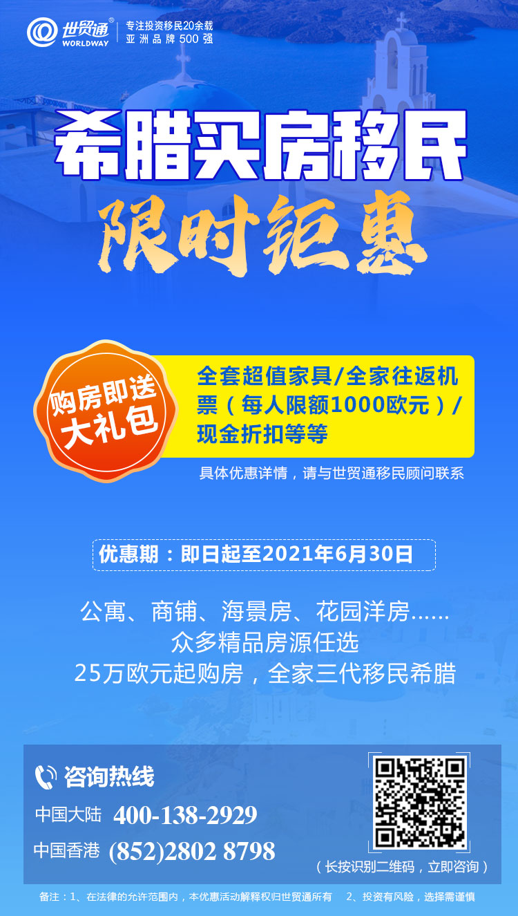 目前,投资者通过希腊黄金签证计划项目,投资25万欧元起的房产,不仅可全家三代申请希腊永久居留签证,畅行26个申根国,同时还能享受希腊教育、医疗等社会福利待遇,而且还可收获希腊永久产权的房产,建立海外第二家园,可谓一举多得。目前,正值希腊买房移民优惠期,机会难得,购房即可获大礼包,有意者须及时把握好时机!