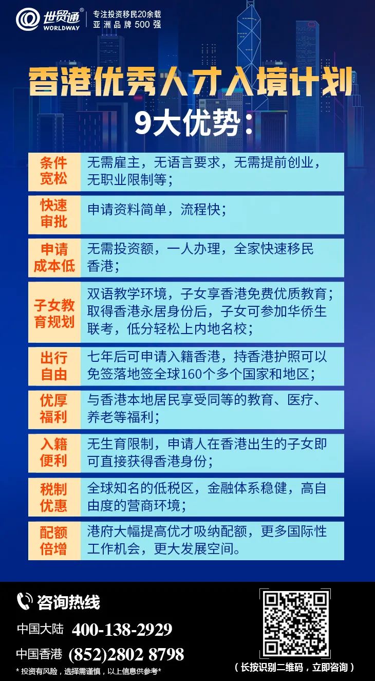 目前,香港优才计划是内地人快速获得香港身份的方式之一,只要申请者符合要求,无须做出任何金额投资,无须事先获得任何本地雇主聘请,到港后可以自由选择工作、定居等等,可谓优势多多!现阶段正是香港身份规划的宽松期,也是香港优才入境计划申请很好的窗口期。如果您具备优秀专业技能或丰富的工作经验,又对香港身份感兴趣,请把握机会,抓紧时间办理吧!