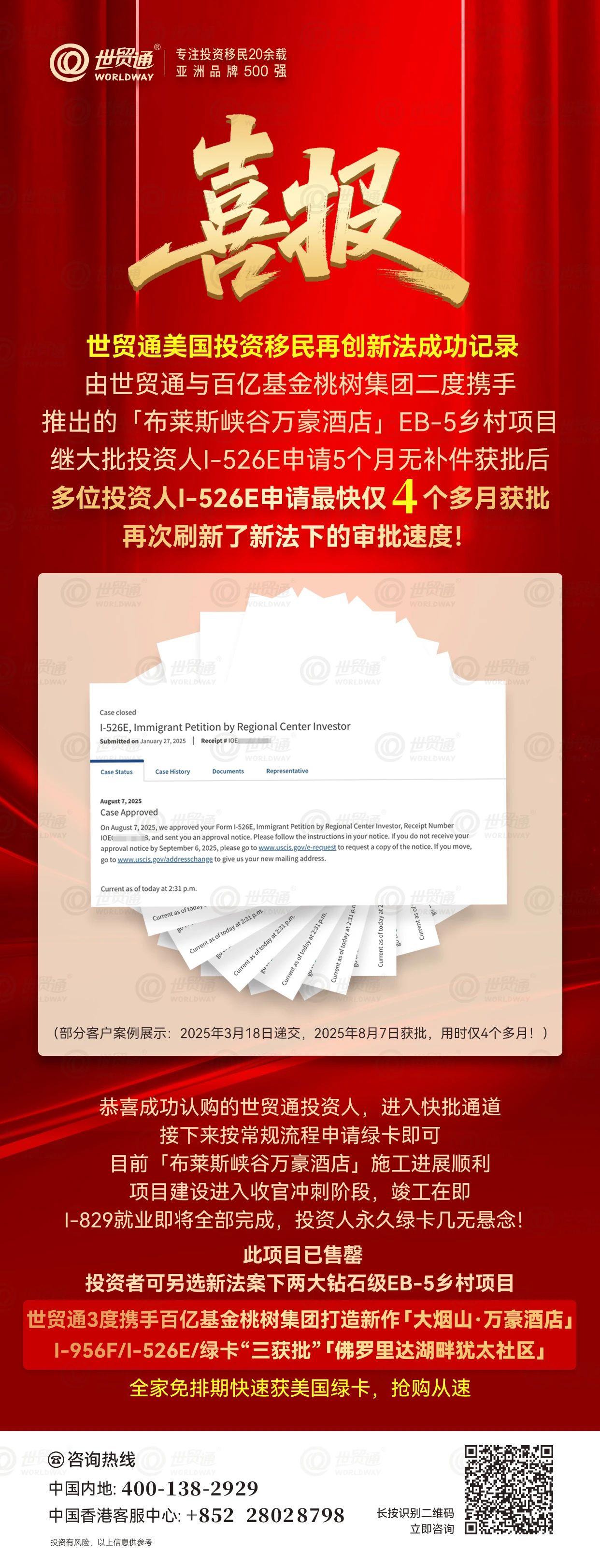 这一惊人速度不仅印证了EB-5新政下乡村项目的优先审批优势,更彰显了世贸通在EB-5项目筛选上的卓越眼光与专业实力!世贸通凭借精准的项目筛选能力,为投资者打造了一条高效、可靠的移民通道,再次证明其在EB-5投资移民领域的领先地位!