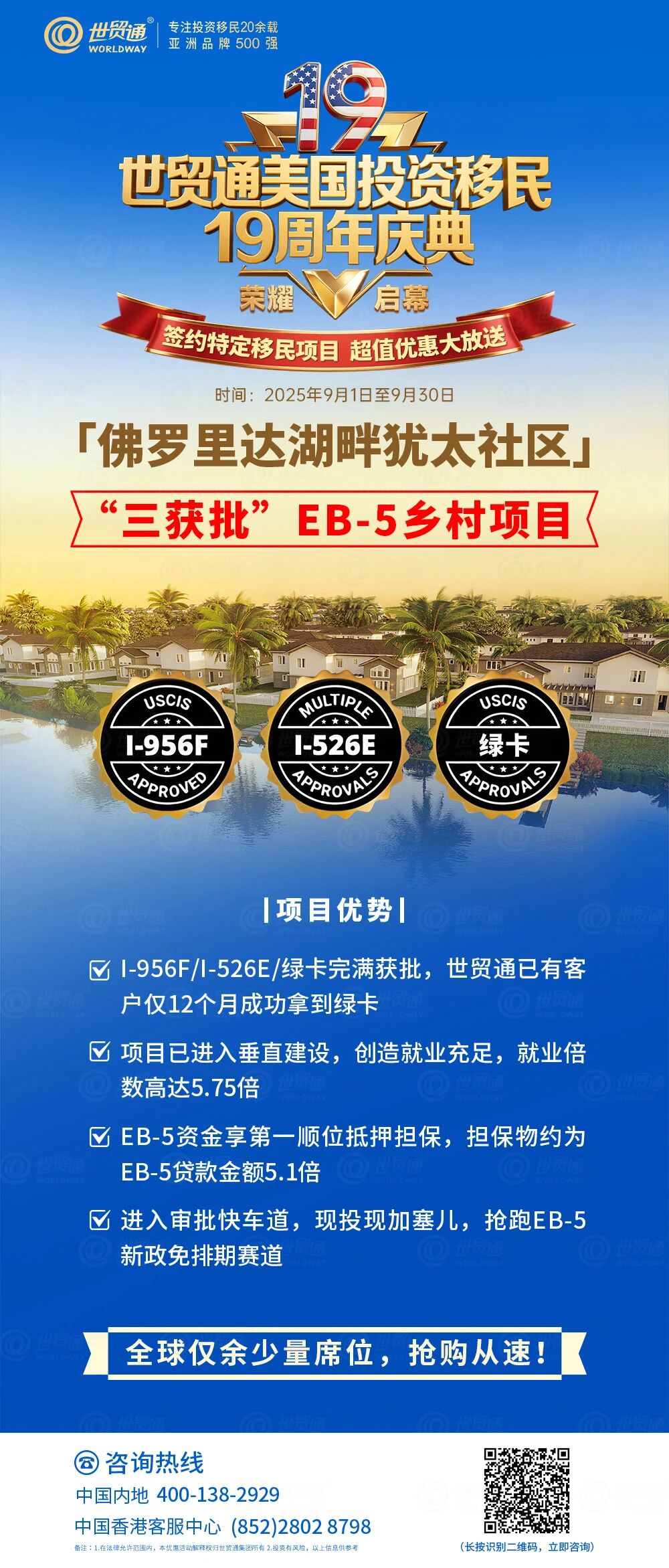 目前,「佛罗里达湖畔犹太社区」EB-5乡村项目投资名额所剩无几,机会珍贵,意向投资人请务必把握最后时机!