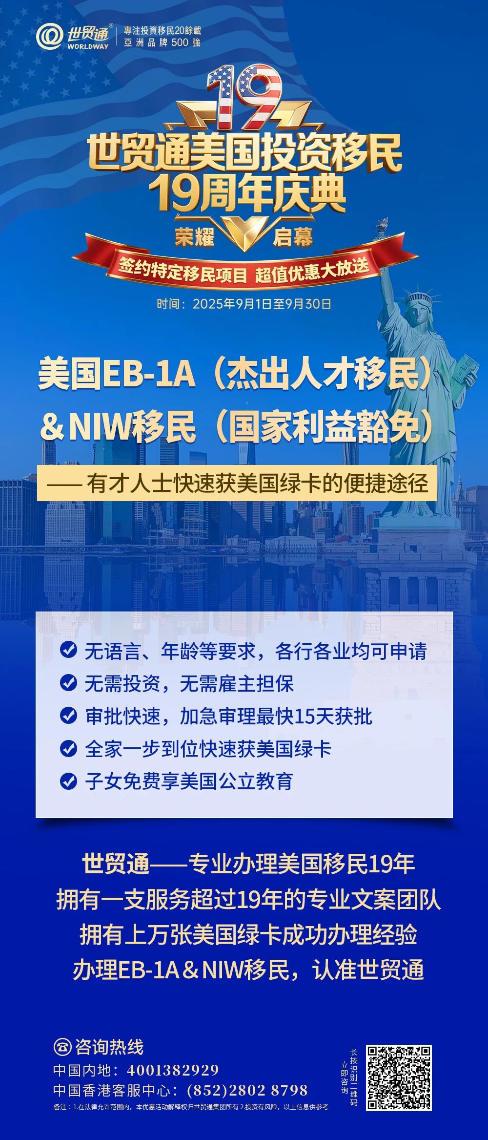 此外,您也可以通过EB-1A杰出人才和NIW国家利益豁免项目移民美国。该项目具有获批快,可加速审理;一人申请,全家移民;无需投资,投入成本低;一步到位获美国绿卡等众多优势,如果您有意向,可以联系世贸通为您进行资格评估及个性化方案定制服务。