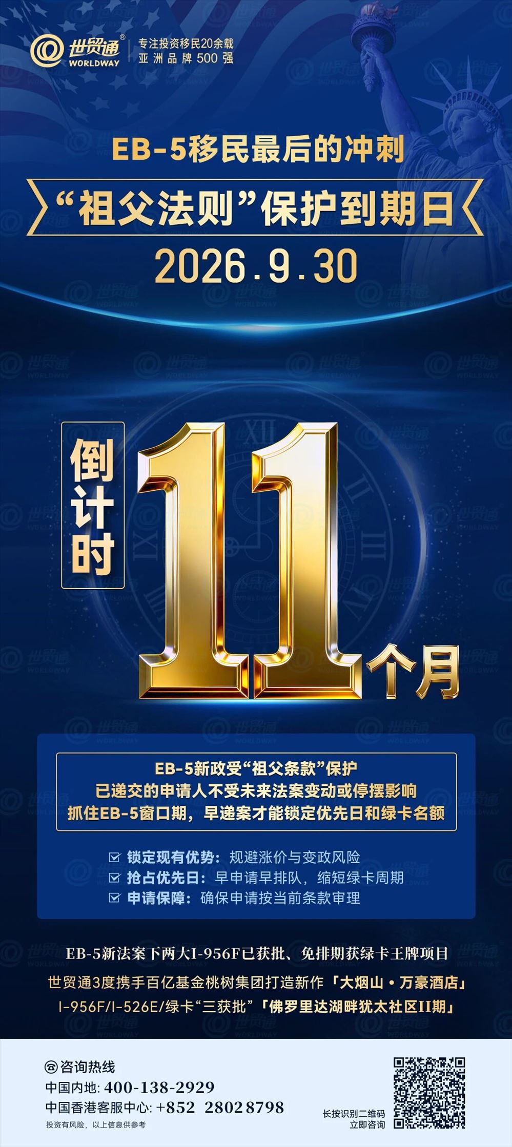 值得注意的是,排期之狼,正在悄无声息地来临。随着乡村预留名额被快速消化,“免排期、快获批”的窗口期正在缩短。并且,EB-5祖父法则已进入最后11个月倒计时(2026年9月30日到期),在此日期前递交的申请将受现行政策保护。机遇稍纵即逝,越早递交,越稳妥!